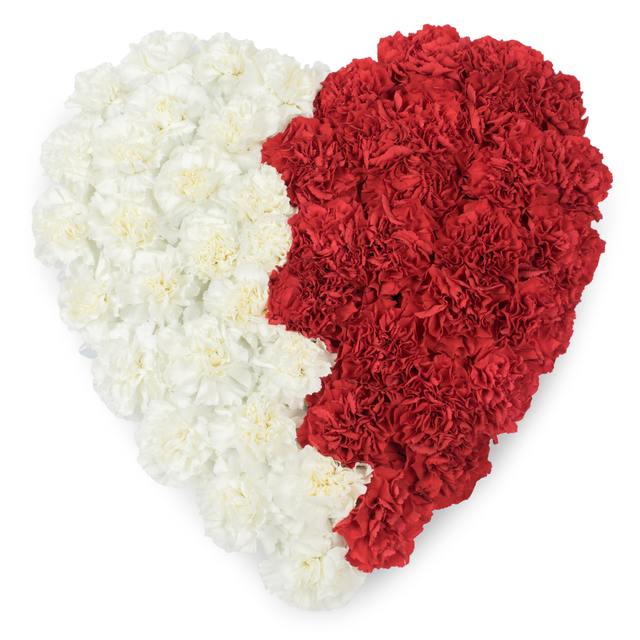 Express your condolences with our unique and vibrant Mixed Carnations Heart designed by Handy Flowers. This elegant bouquet combines white and red carnations, symbolizing purity and love.