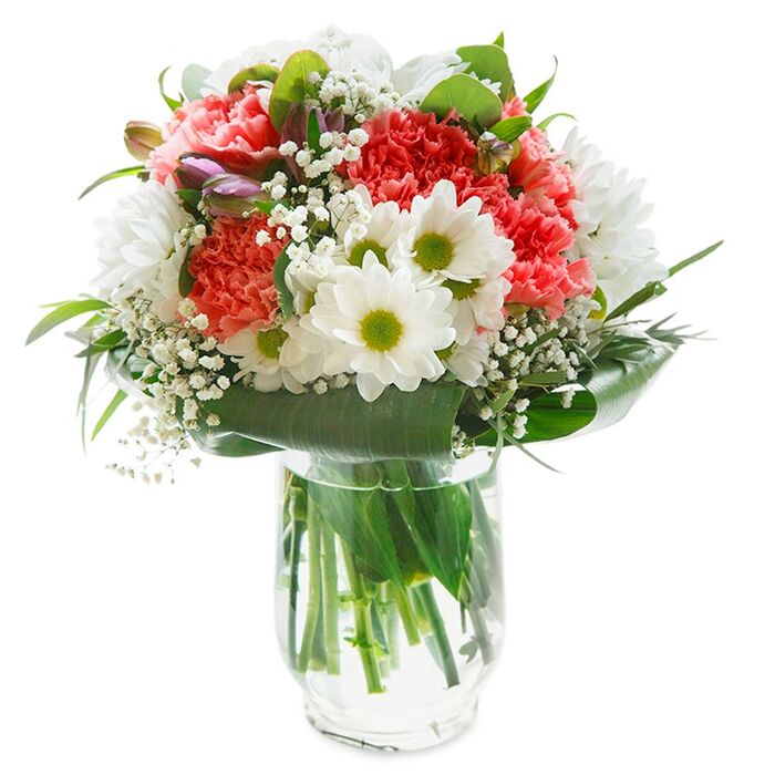 Enhance any occasion with our sophisticated seasonal flower arrangement. This exquisite bouquet features a blend of snow-white chrysanthemums, delicate gypsophila, and soft light pink carnations, all artfully arranged with aspidistra leaves. The elegant design and harmonious colors make it a standout choice for a luxurious gift.